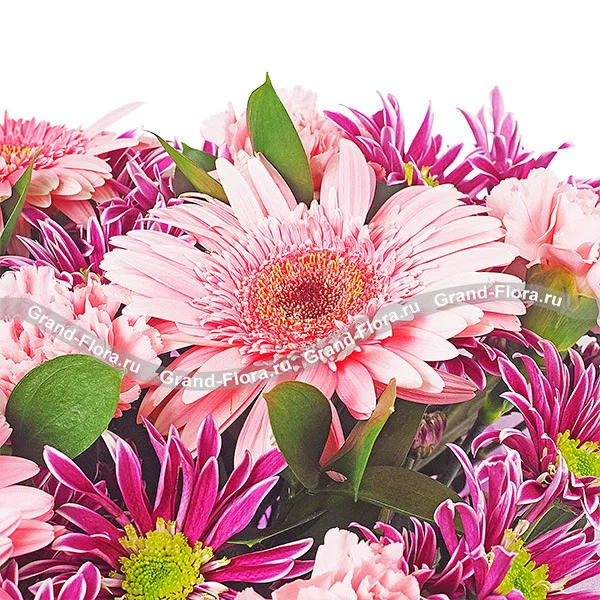 Стандартный (на фото): гербера розовая - 3 шт., гвоздика одноголовая розовая - 6 шт., хризантема кустовая фиолетовая - 4 шт., рускус, фетр фиолетовый.